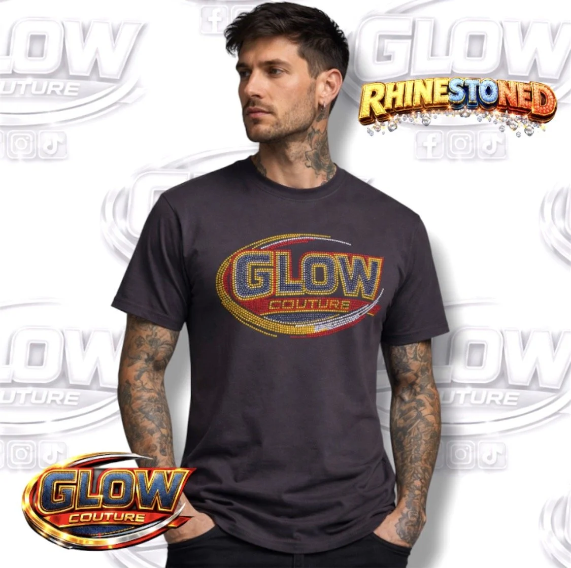 GLOW COUTURE › NEW LOGO T-shirt Image 1 of 1 NEW LOGO T-shirt £22.00 Rhinestoned Logo on 100% cotton black t-shirt Age/Size: 5-6 7-8 9-11 12-13 Adult Small Adult Medium Adult Large XL 2XL 3XL Add To Cart Added! Rhinestoned Logo on 100% cotton black t-shirt